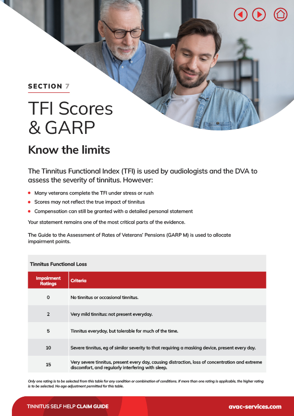When you submit your claim, the Department of Veterans Affairs may require an audiologist visit and a self-reported Tinnitus Functional Index (TFI) questionnaire. Even with a low TFI score, your symptoms are important. Providing a detailed personal statement can help clarify your case.